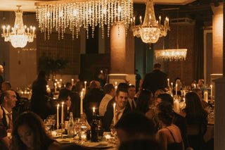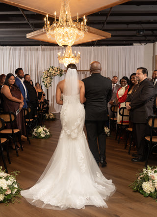Receptions are hosted in a mid-century modern ballroom. The décor is a beautiful mix of exposed brick, custom wood, black metals & brass accents. The clear cut crystal chandeliers with intricate candles finish this design with a truly regal quality perfect for a once in a lifetime wedding.